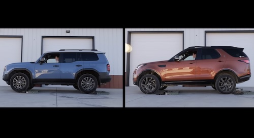 Свежее видео, сравнивающее Prado 250 и Discovery 5 с точки зрения работы трансмиссии с использованием роликов под колесами.