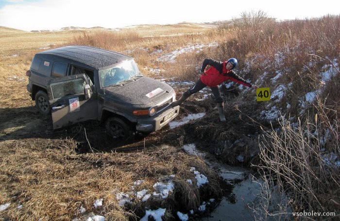 Кроме этого, очень важно взаимоотношение с пилотом. Конечно, в каждом экипаже они складываются по разному, учитывая опыт, эмоциональность, возраст и многие прочие. Штурман в обычной жизни тоже является водителем и удержаться от соблазна давать советы пилоту многим штурманам не удается. Как и пилоту — в плане навигации. В нашем экипаже некоторые риски могли возникнуть, так как по большому счету с Равилем мы знакомы только по одному путешествию. Тем не менее в этой гонке отношения сложились близкими к идеальным с моей точки зрения. Договорившись на берегу и разделив роли, мы всю гонку строго придерживались установленных правил и, наверное, этот фактор тоже сыграл не малую роль в полученных результатах. Поэтому господа штурмана, начинайте завидовать 🙂 Мой пилот ни разу не оспорил предложенный выбор точек и направлений, мы вообще не дискутировали на эту тему. В свою очередь, когда доезжали до точки и вставал вопрос, как ее брать, я полностью передавал все бразды правления пилоту, потому что именно он знает свою машину как никто другой, и не мне ему давать советы в этот момент. Конечно, находясь за бортом, посильная помощь от штурмана обязательна, чтобы исключить повреждения машины и т.п. Но не в машине и во время движения.